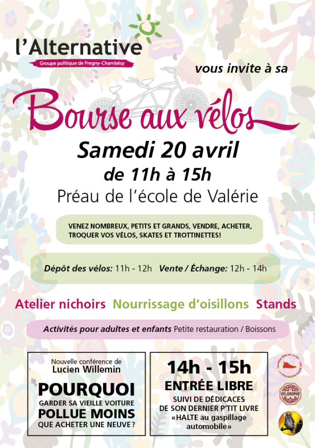 L'alternative vous invite à participer à la prochaine bourse aux vélos qui se déroulera le samedi 20 avril 2024 sur le préau de l'école de Valérie.